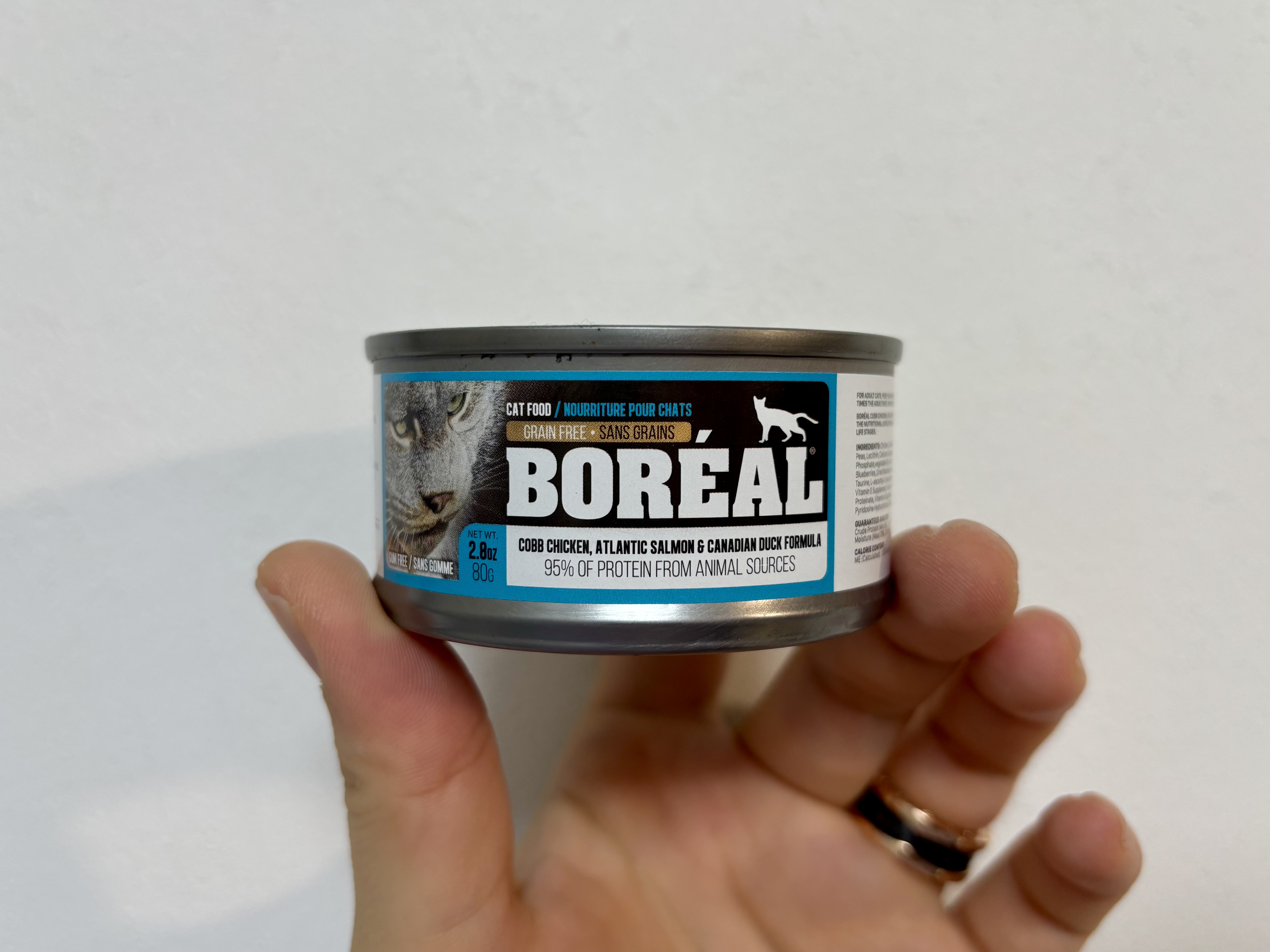 이번에 먹여본 건 보레알(Boreal) 캔이다. 아마존 미국에서는 판매하지 않는 제품이고, 나는 박람회에서 구매했다. 캐나다 제품인 것 같고, 솔직히 말하면 성분표를 보고 바로 샀다. 주식캔으로 쓰기에도 꽤 좋아 보였고, 단백질 구성도 탄탄해서 “이건 괜찮겠다” 싶었다.