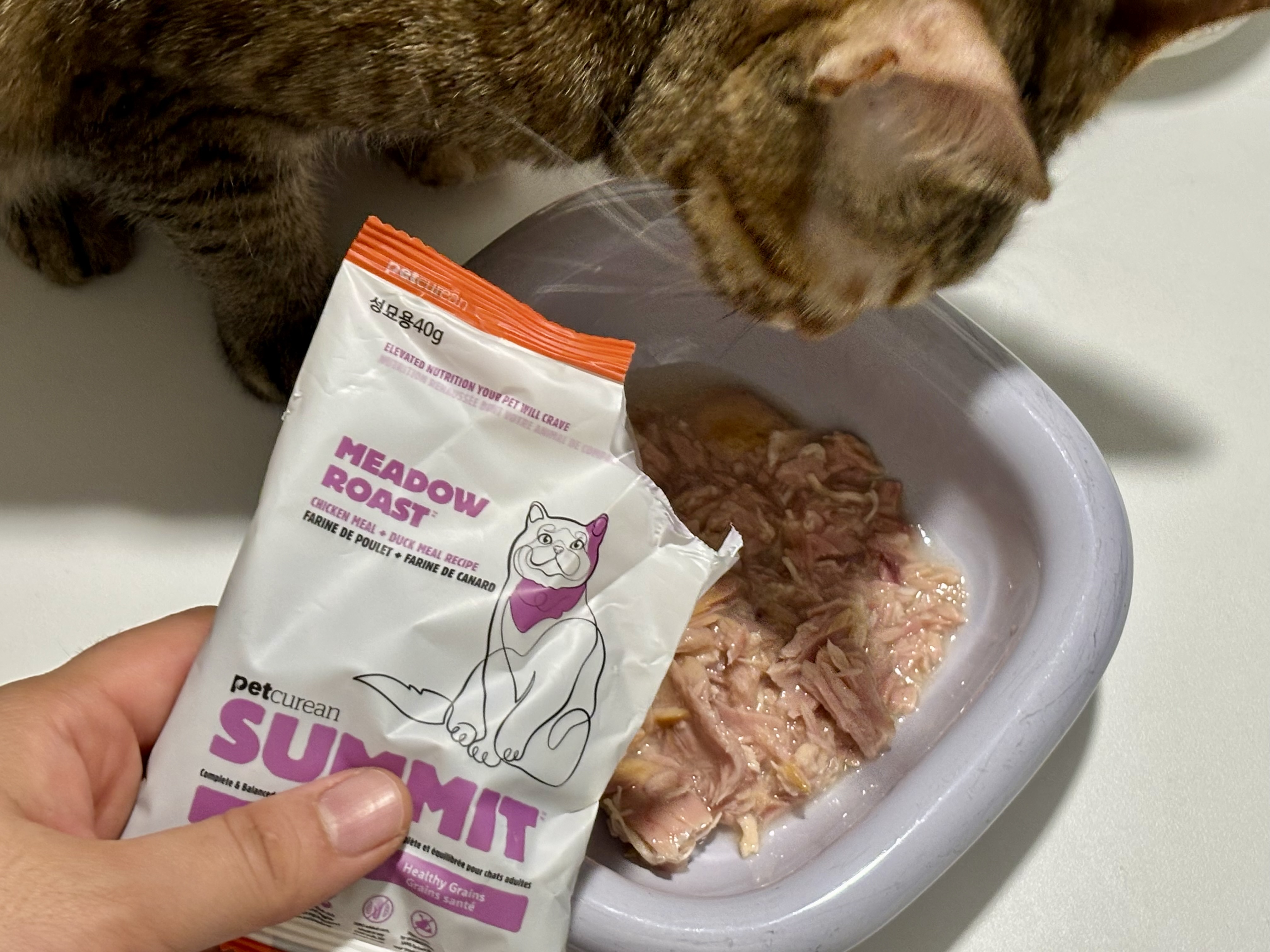 파테 위에 얹어주면 고양이 반응이 달라지는 마법의 주식 건식 Petcurean Summit Meadow Roast 사료