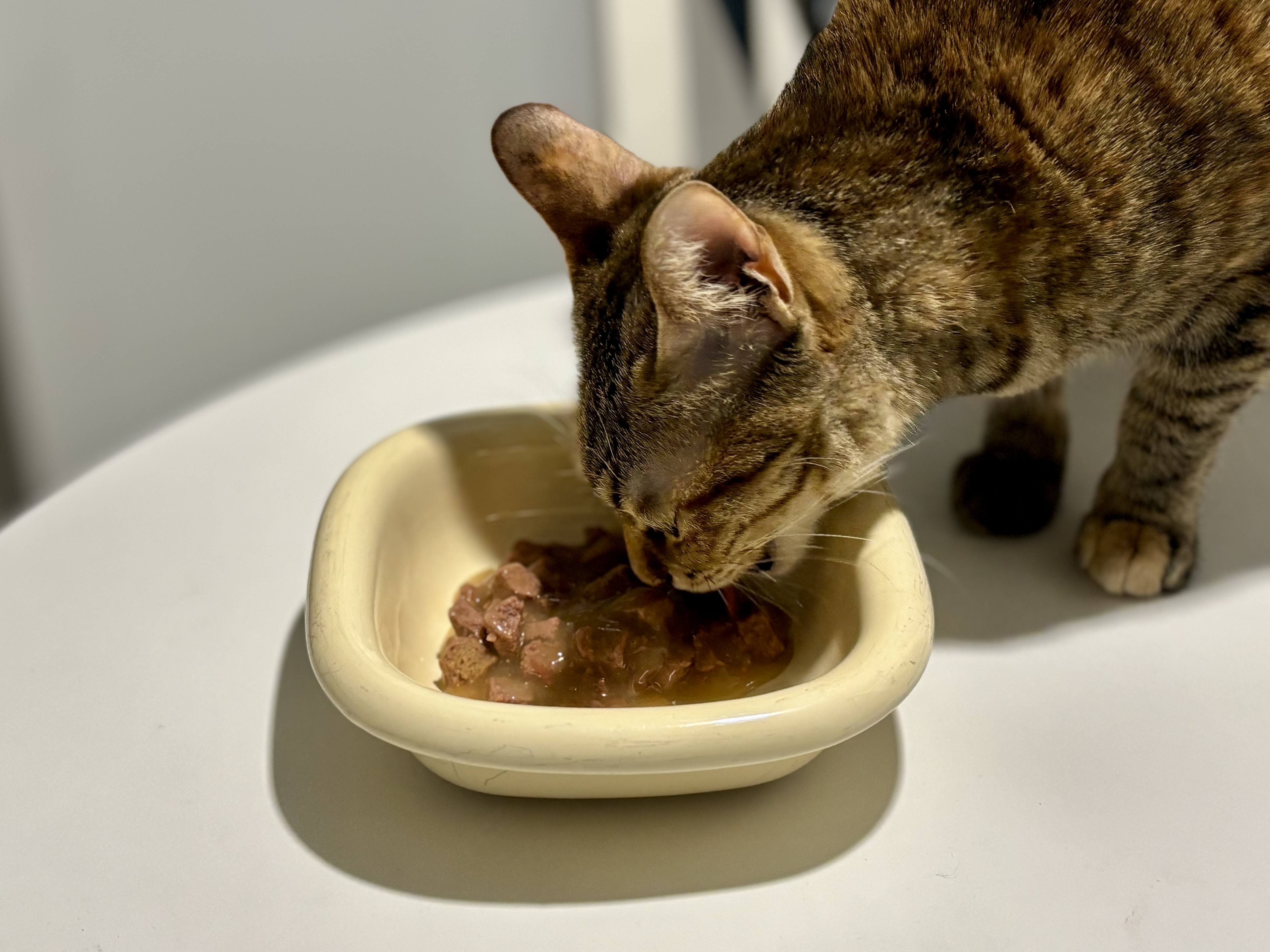 파우치 타입이라 준비는 간단했다. 그릇에 덜어놓자마자 냄새를 맡으러 다가왔고, 그 순간부터 예감이 나쁘지 않았다. 결국 새벽이는 바로 먹기 시작했고, 놀랍게도 남기지 않고 다 먹었다. 한 번에 몰아서 먹는 타입은 아니라서 중간중간 쉬긴 했지만, 결국 그릇을 비워줬다는 것만으로도 충분히 고마웠다.
