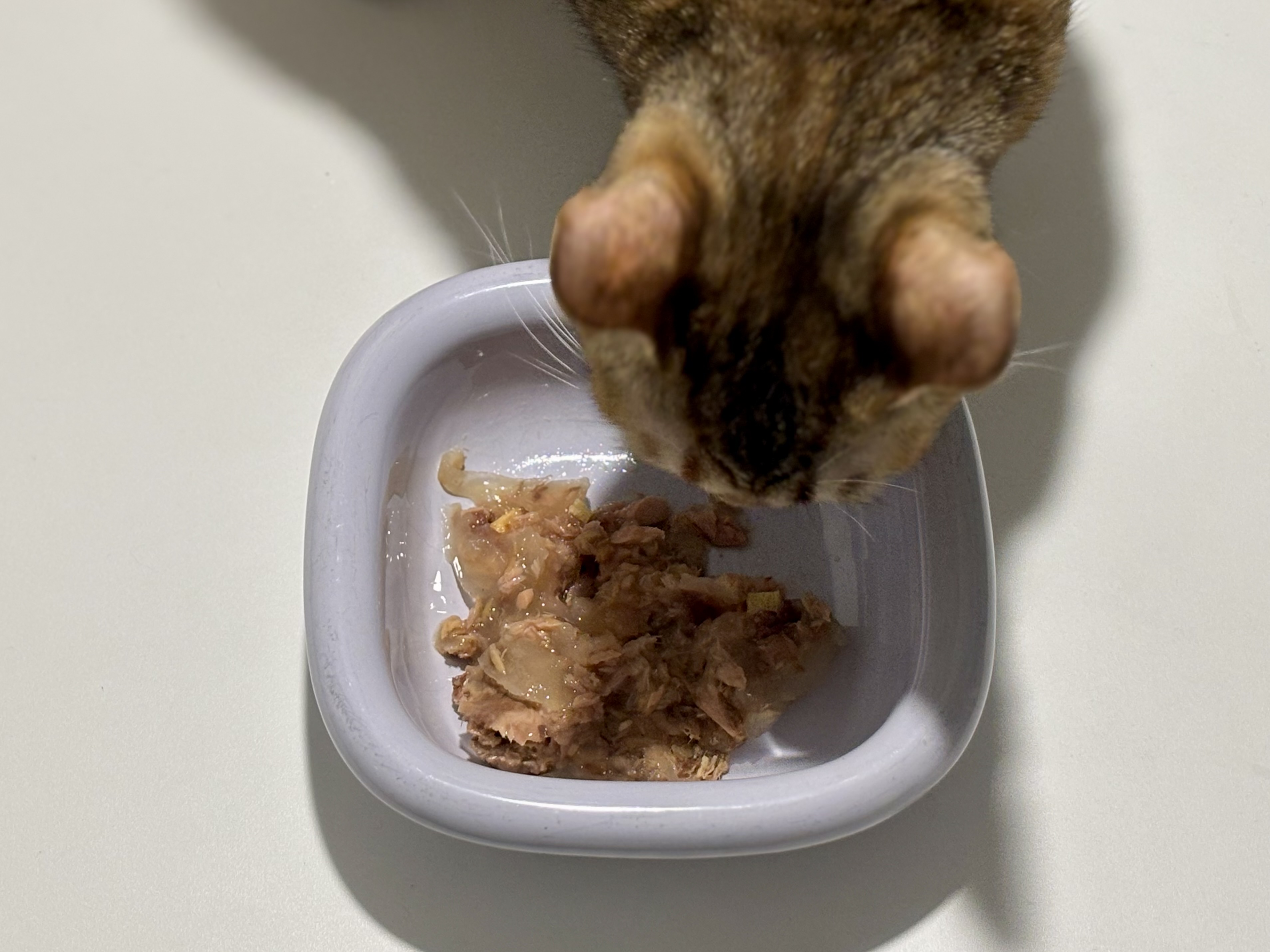 파우치를 열자마자 새벽이는 바로 다가왔다. 과한 반응은 아니었지만, 그렇다고 의심하는 기색도 없었다. 냄새를 맡고는 조용히 먹기 시작했다. 새벽이는 원래 한 번에 많이 먹는 타입이 아니라서, 조금 먹고 쉬었다가 다시 와서 먹는 식인데, 이번에도 딱 그 패턴이었다. 그렇게 몇 번에 나눠서 결국 그릇을 다 비웠다.