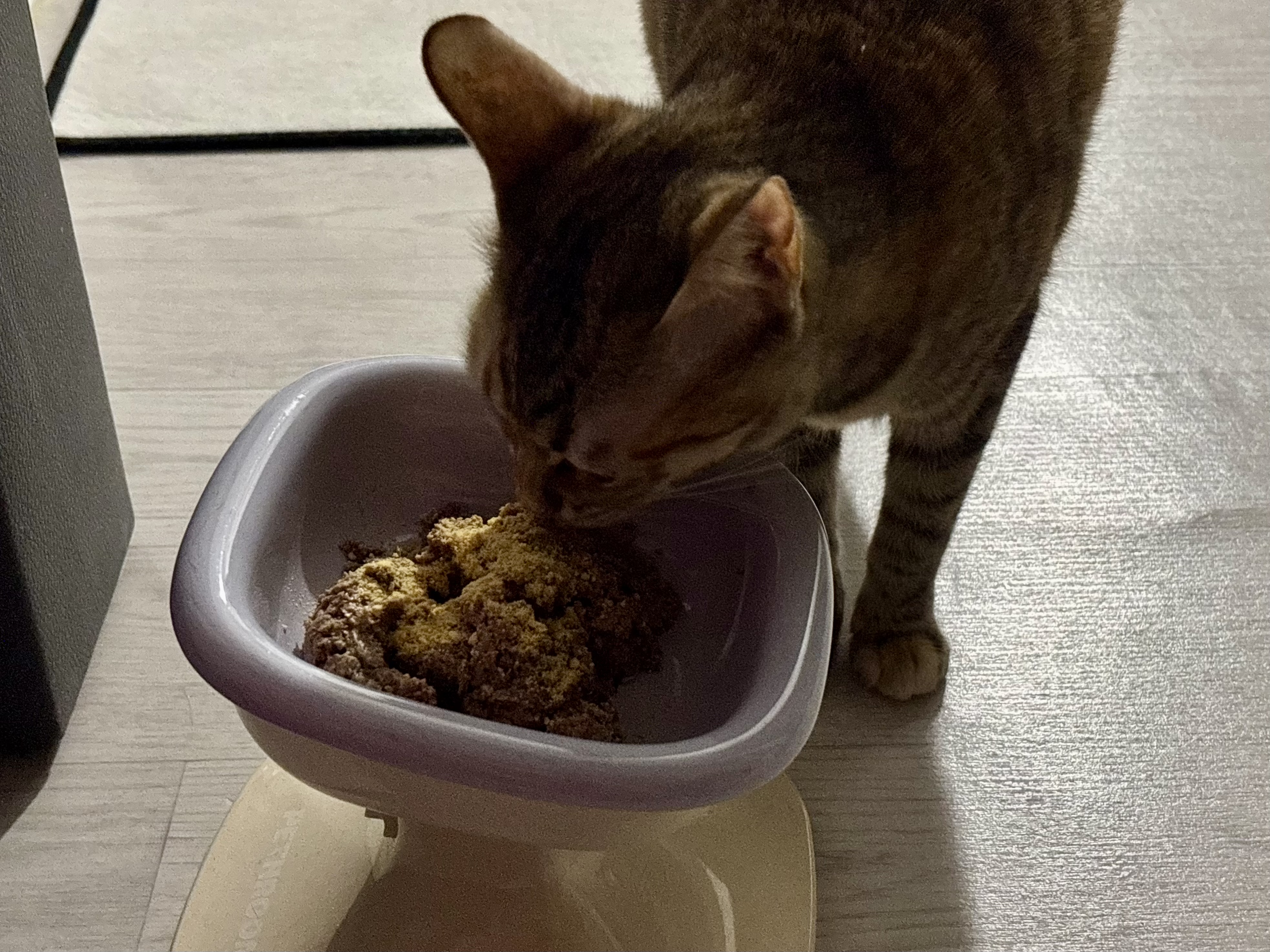 이 제품은 질감부터가 새벽이 취향과는 많이 다르다. 꾸덕하고 단단한 파테 타입이라 캔에서 잘 떨어지지도 않고, 숟가락으로 떠서 옮겨야 한다. 새벽이는 이런 질감을 좋아하지 않는 편이고, 나 역시 개인적으로는 이런 파테를 선호하지 않는다. 그릇에 담는 순간부터 ‘이번에도 쉽지 않겠다’는 생각이 들었다.
