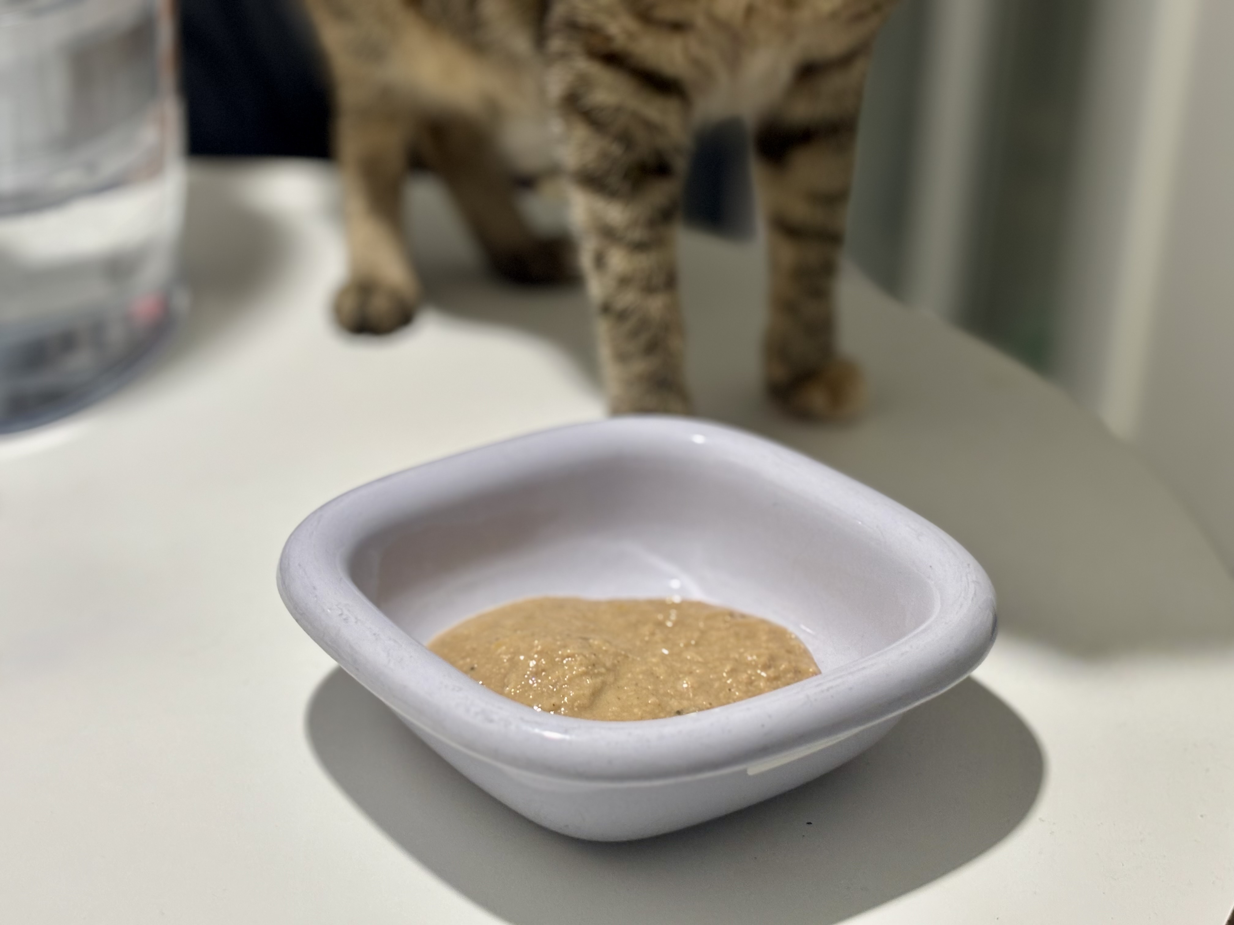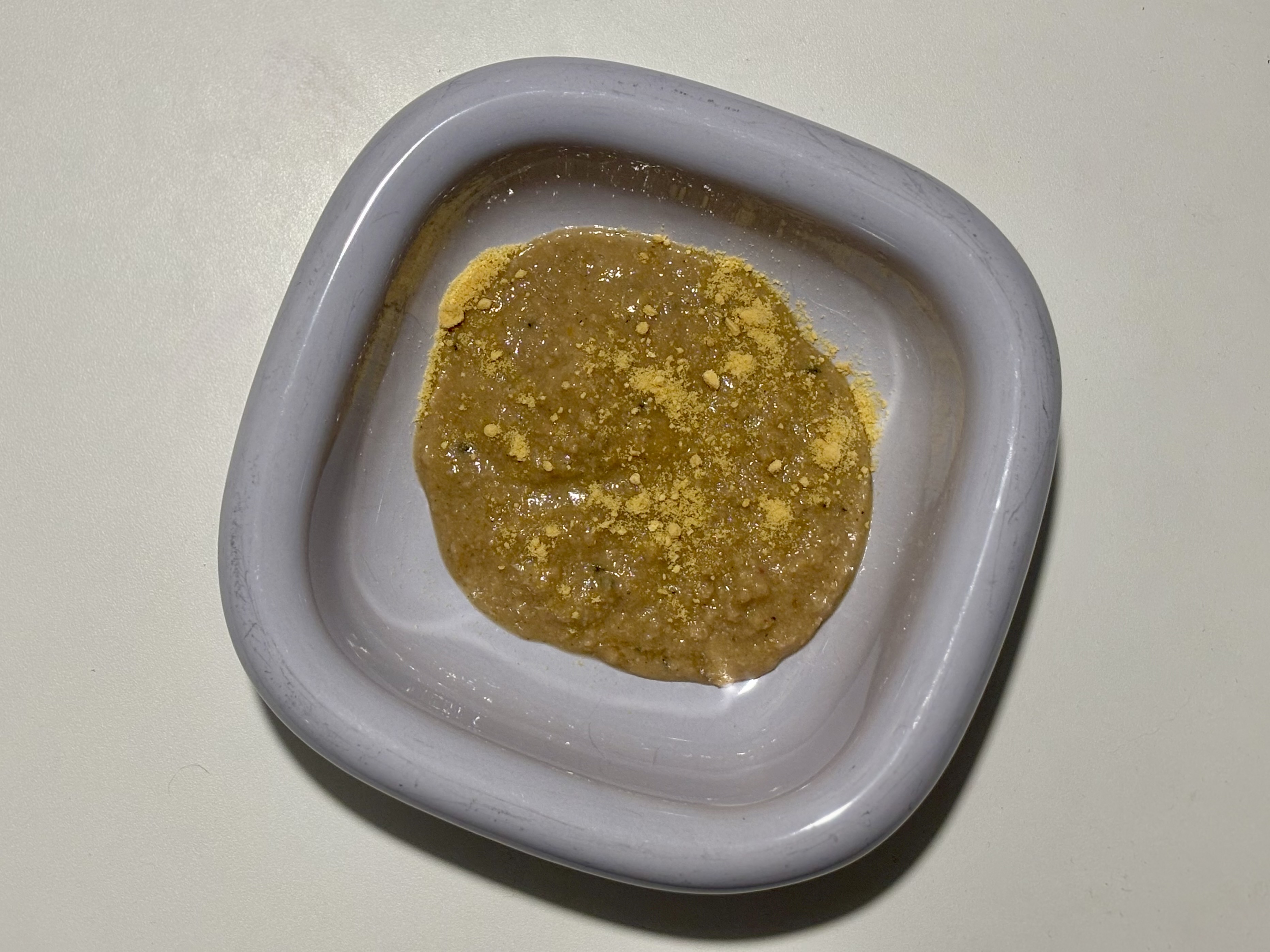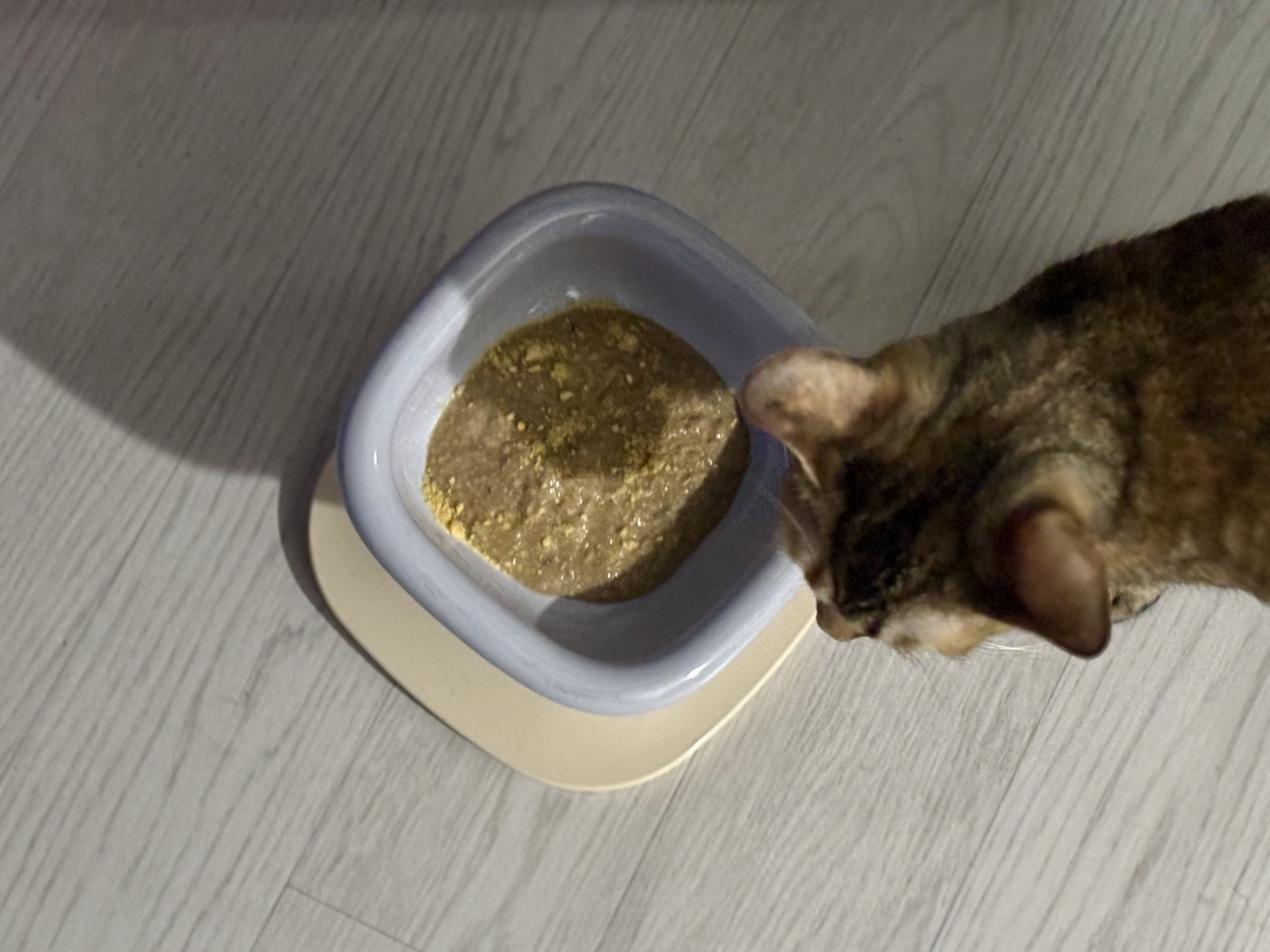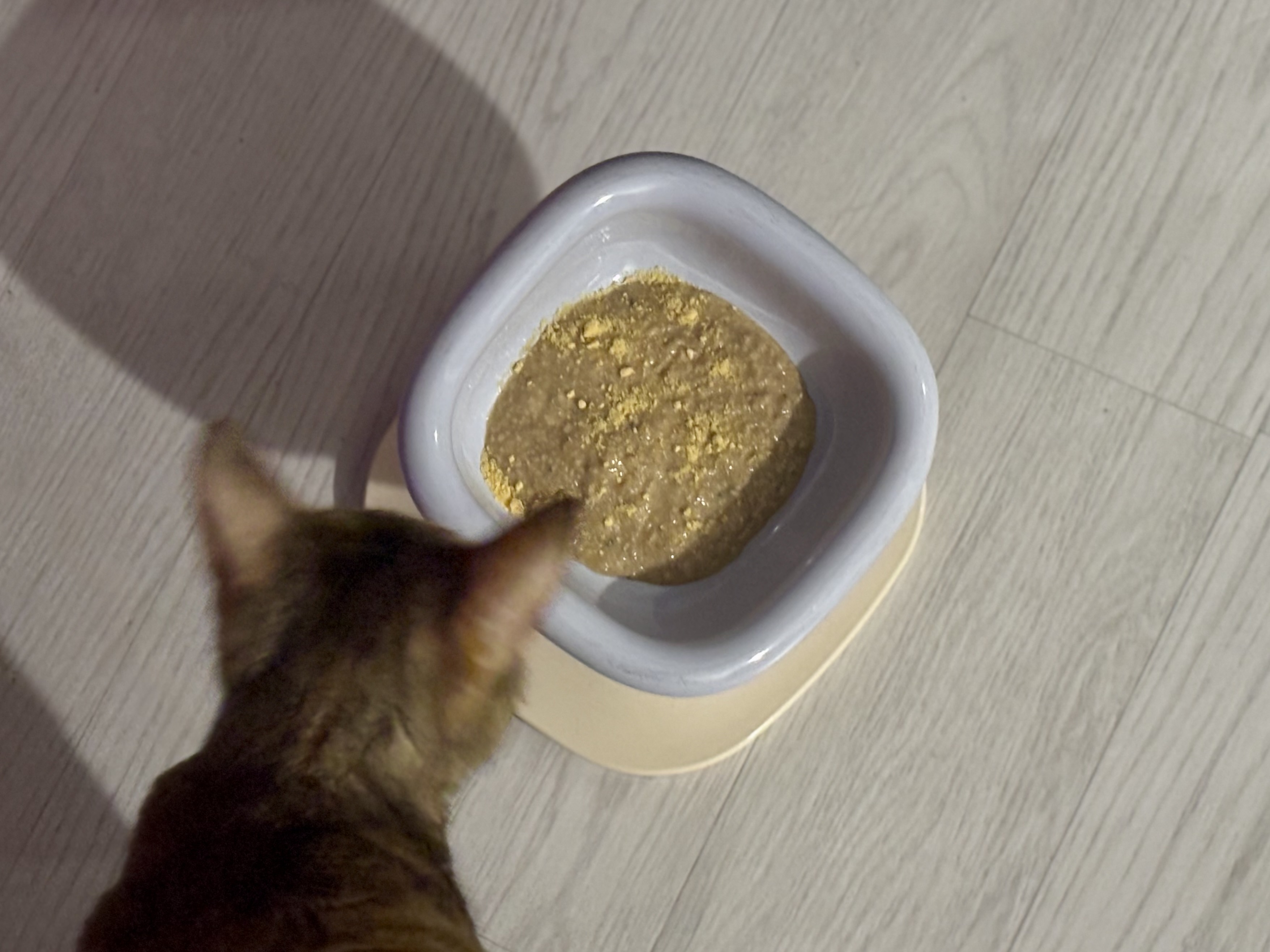 이번에도 효과는 있긴 있었다. 새벽이가 다시 와서 토핑이 뿌려진 겉면만 살짝 핥아먹었다. 하지만 거기까지였다. 시간이 지나서 다시 확인해보니, 토핑 가루가 묻어 있던 부분만 먹어놓고 나머지는 그대로 남아 있었다. 몇 시간 더 지켜봤지만 결국 추가로 먹지는 않았다.