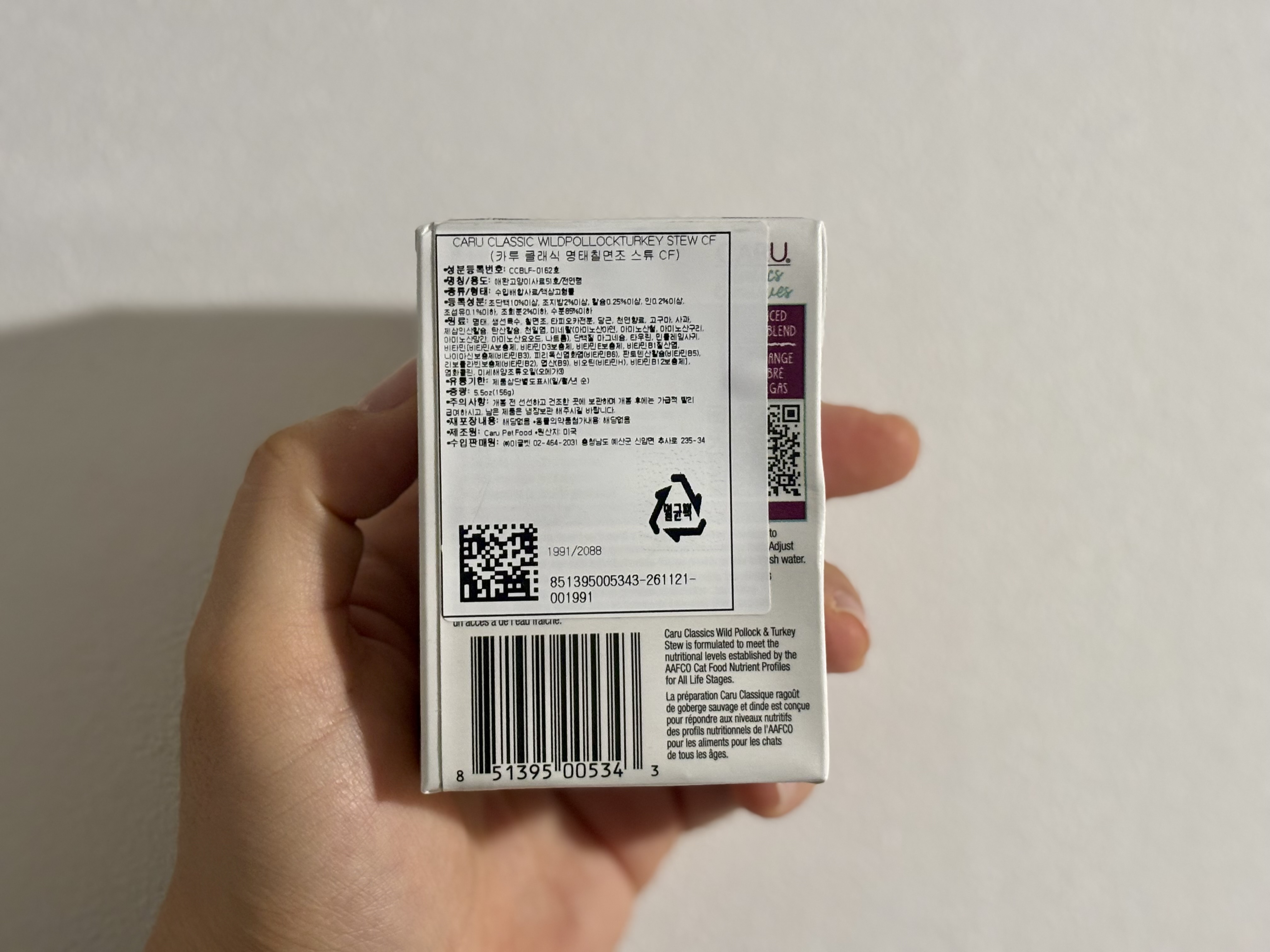 Caru 제품은 고양이 사료 쪽에서는 성분 좋기로 꽤 유명한 브랜드다. 그래서 이번에도 사실 기대를 조금은 했었다. 사람 먹는 재료 기준, 스튜 타입, 소화 잘 되게 만든 레시피까지. 적어도 “나쁜 선택”은 아니라고 생각했으니까.