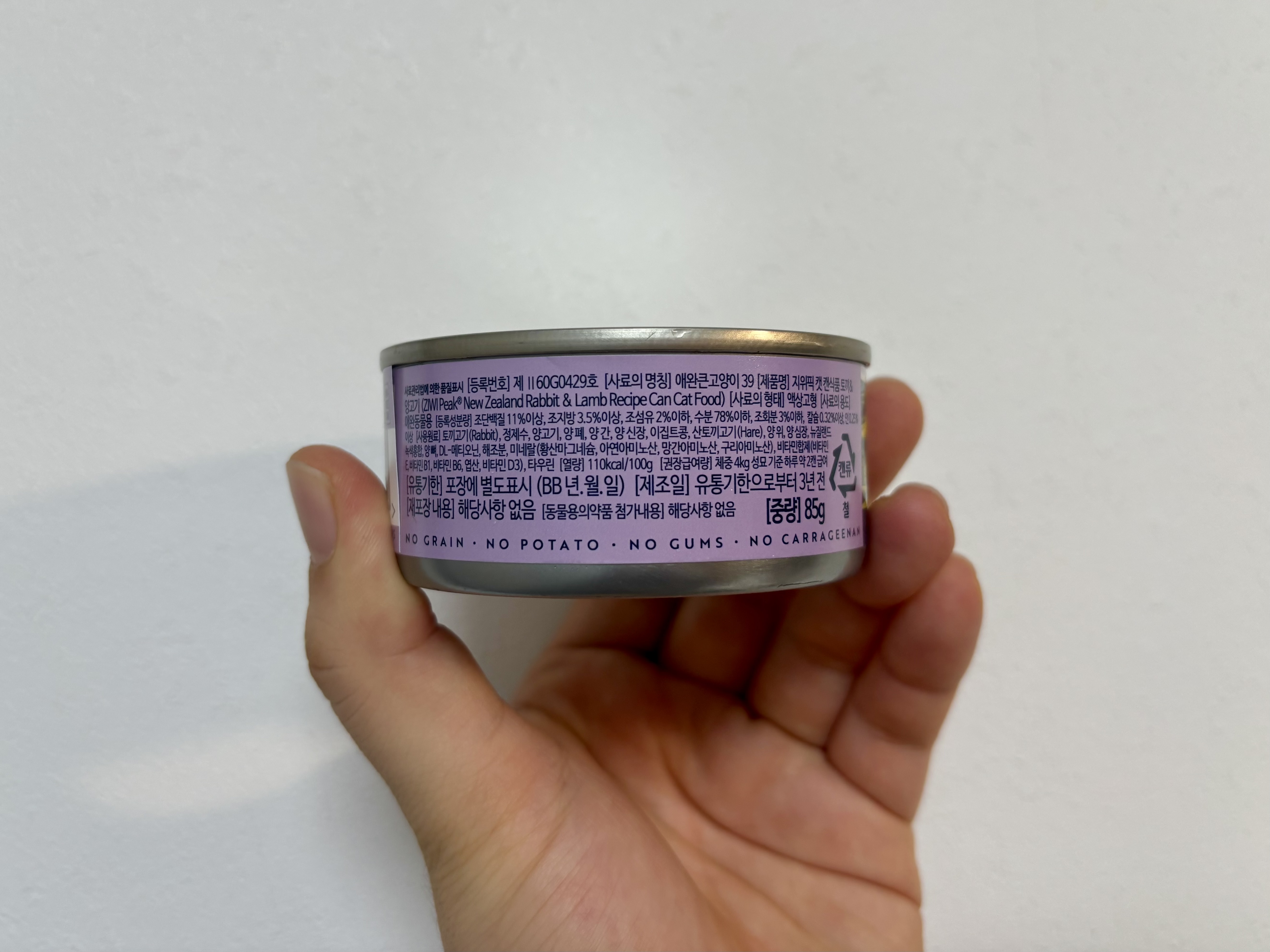 성분을 보면 더 그렇다. 토끼와 양, 각종 내장과 초록입홍합까지. 고양이를 키우는 사람이라면 한 번쯤은 “이건 진짜 좋겠다”라는 생각이 드는 구성이다. 나 역시 그랬고, 그래서 새벽이가 양을 좋아하지 않는다는 걸 알면서도 이번엔 혹시나 하는 마음으로 캔을 열었다.
