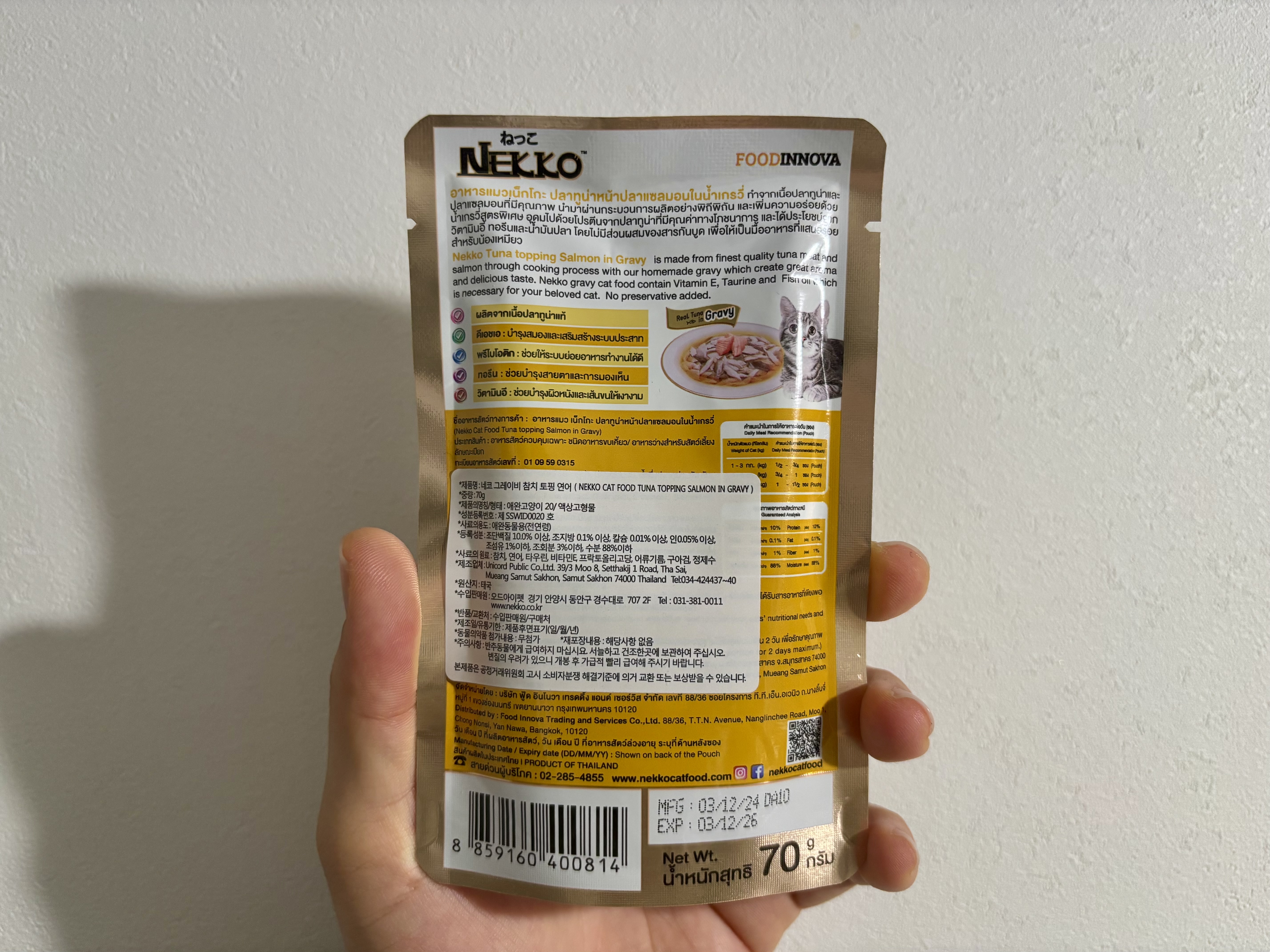 집에 쌓여 있는 파우치들을 정리하다가, 이건 기록으로라도 남겨두는 게 좋겠다 싶어 다시 꺼내본 제품이다. Nekko의 Tuna Topping Salmon in Gravy. 포장에 일본어가 큼직하게 적혀 있어서 처음엔 일본 브랜드인 줄 알았는데, 알고 보니 태국 방콕에 기반을 둔 브랜드라고 한다. 미국 아마존에서는 잘 보이지 않지만, 한국에서는 비교적 쉽게 만날 수 있는 편이다.
