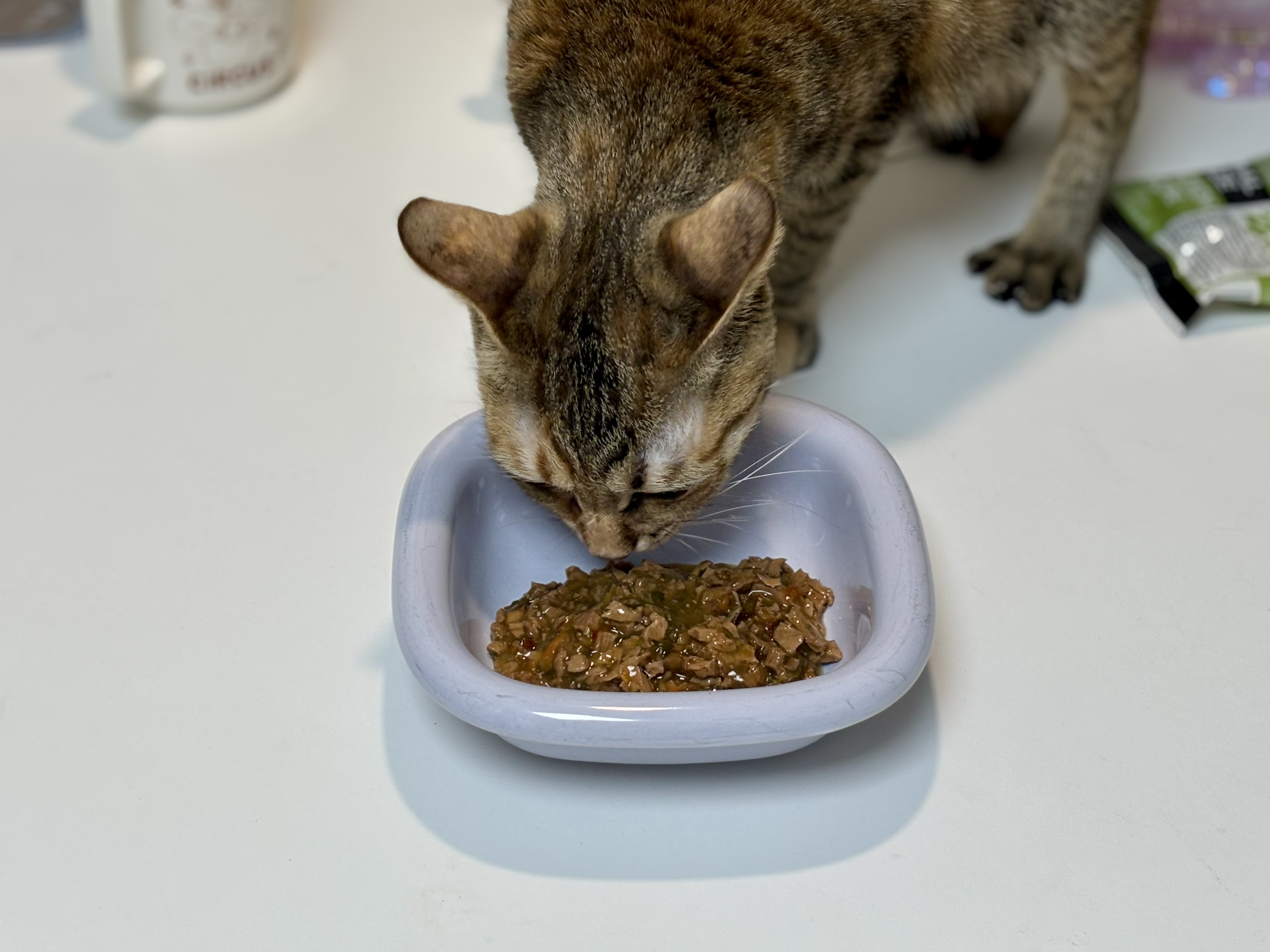 뚜껑을 열자마자 애옹애옹, 제법 크게 울면서 바로 그릇 앞으로 다가왔다. 냄새만 맡고 돌아설 줄 알았는데, 망설임도 없이 먹기 시작했다. 중간에 잠깐 쉬긴 했지만, 다시 와서 또 먹고, 또 먹고. 결국 그릇은 말끔해졌다. 준비해뒀던 니블 간식은 그대로 다시 찬장으로 돌아갔다.