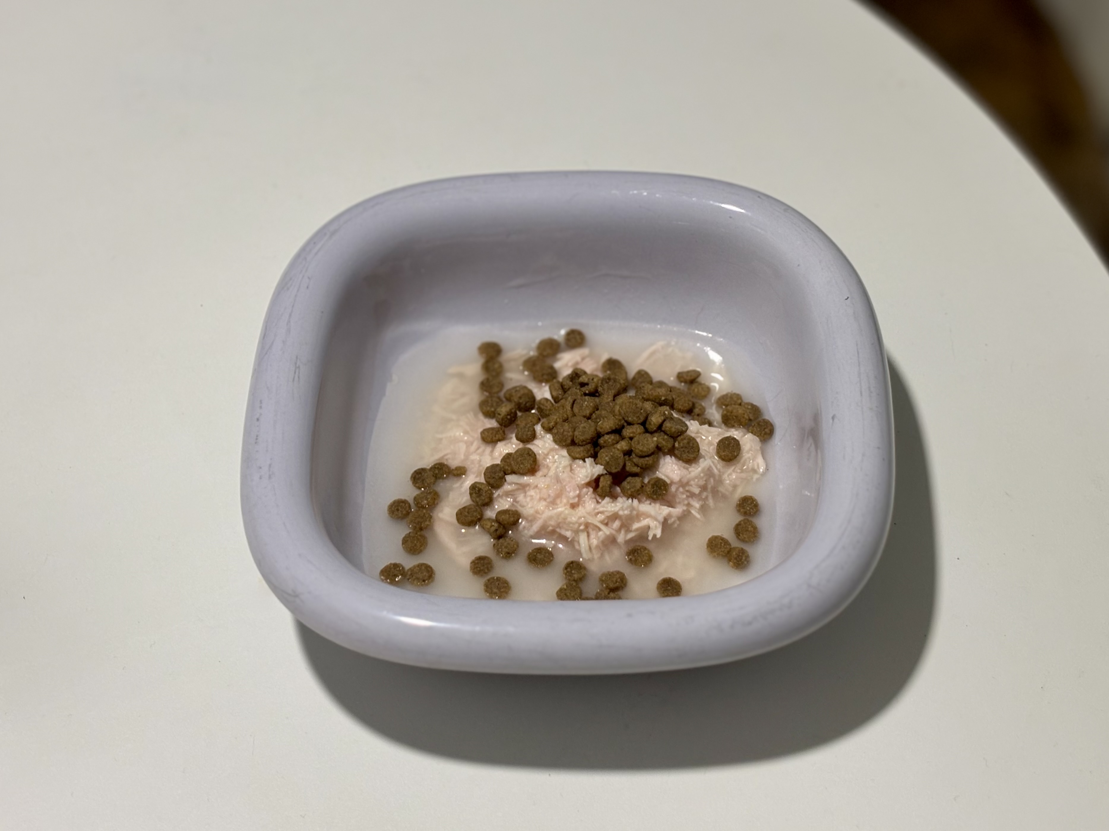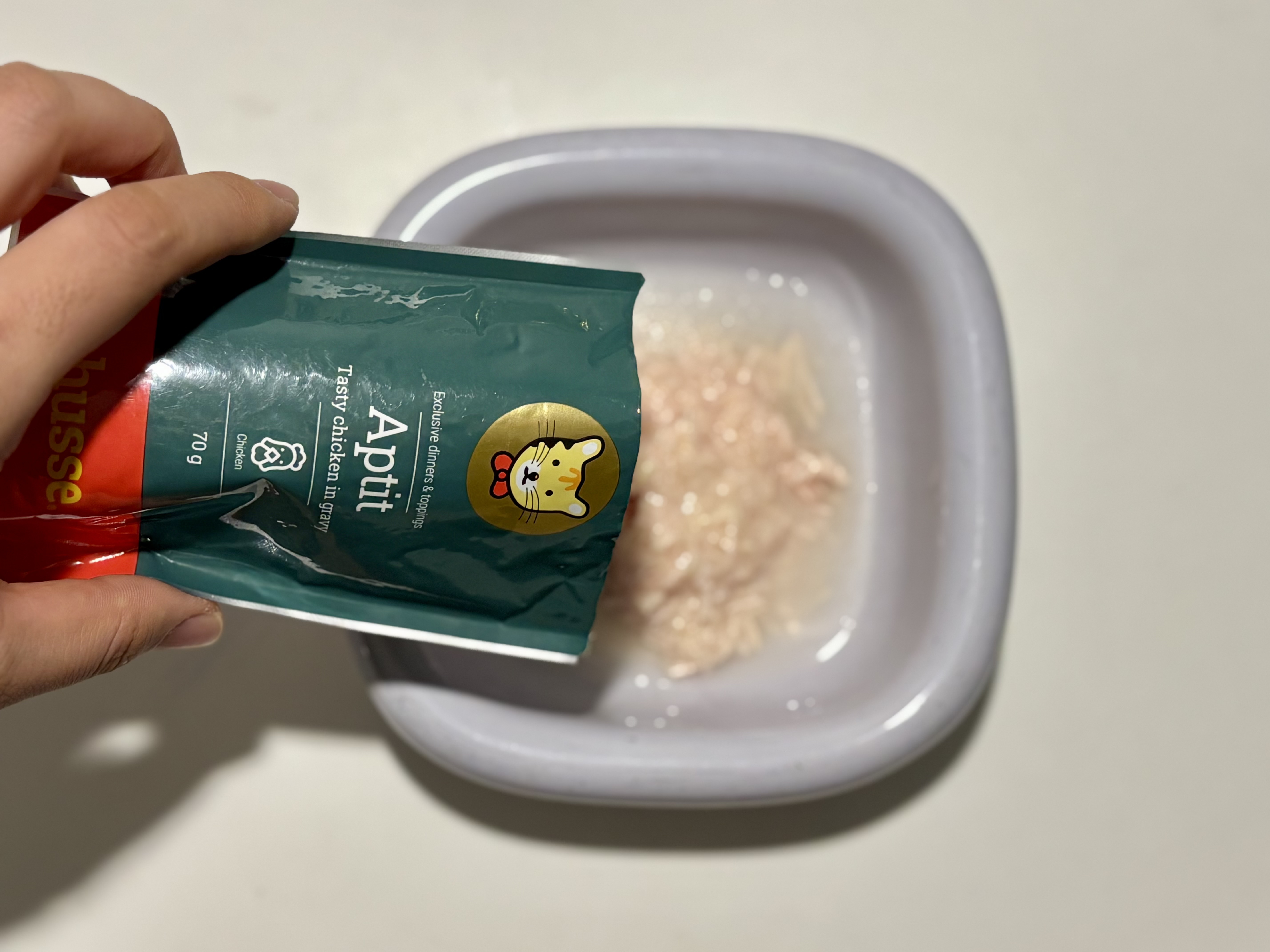 게다가 이 제품은 완전식이 아니라 그레이비 소스와 치킨이 들어간 토핑용 파우치라서, 큰 고민 없이 가볍게 급여해봤다.
