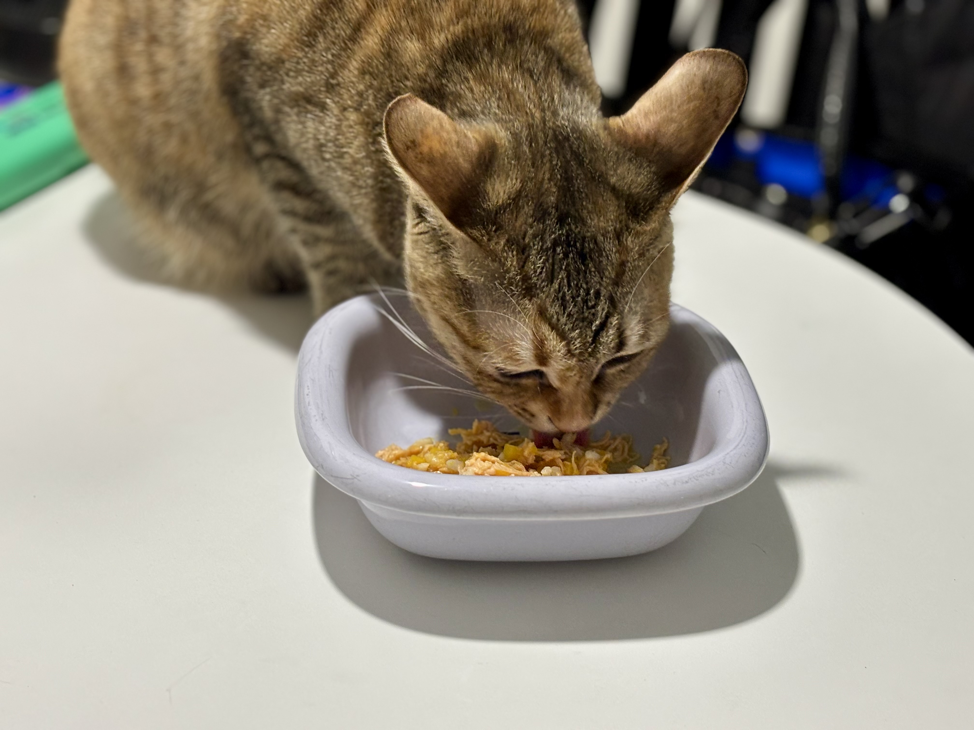 그릇에 담아주자마자 바로 먹기 시작했고, 평소처럼 조금 먹고 쉬는 것도 없이 계속 집중해서 먹었다. 그리고 내가 건식 사료를 섞어주려고 준비하는 사이에 이미 절반 정도를 다 먹어버렸다.